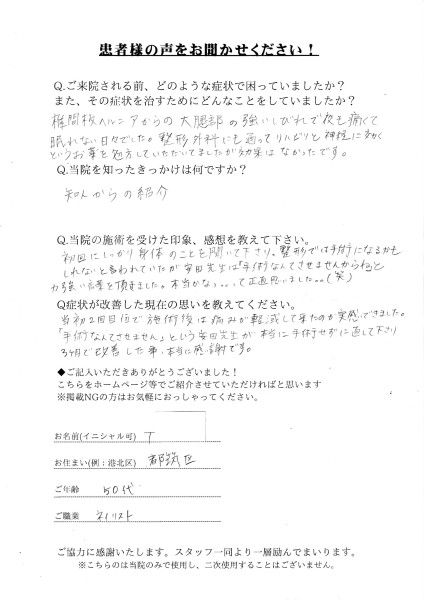 「手術せずに治して下さり、本当に感謝です!」 椎間板ヘルニアからの大腿部の強いしびれで夜も痛くて眠れない日々でした。整形外科にも通ってリハビリと神経に効くというお薬を処方していただいていましたが、効果はなかったです。 知人からの紹介で当院を知りました。 初回にしっかり身体のことを聞いて下さり、整形では手術になるかもしれないと言われていたが、安田先生は「手術なんてさせませんからね」と強い言葉を頂きました。本当かなって正直思いました。(笑) 当初2回目位で施術後は痛みが軽減して来たのが実感できました。「手術なんてさせません」という安田先生が本当に手術せずに治して下さり3ヶ月で改善した事、本当に感謝です。 (T様 50代 女性) ※効果には個人差があります |