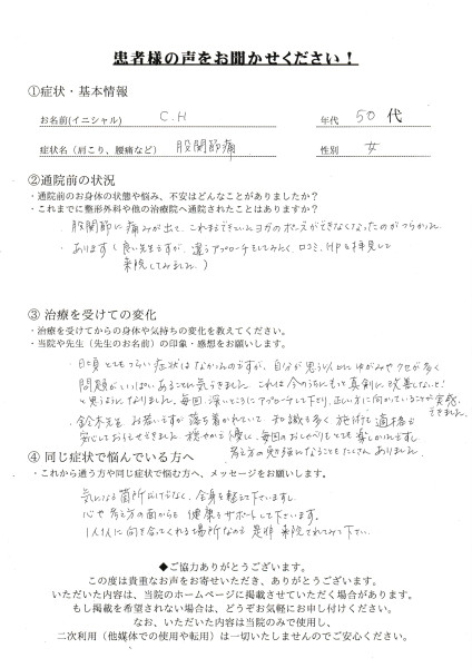 「通院を継続していくうちに股関節の痛みもなくなり、感謝です!」