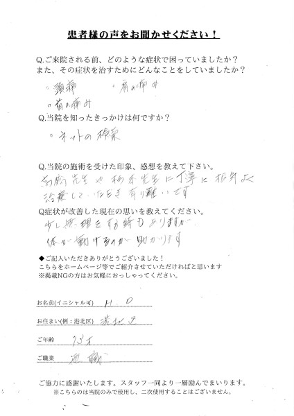 現在は、楽になりこれからも続けたいと思います。安田先生に丁寧に施術していただき感謝しています。ありがとうございます。これからもよろしくお願いします。