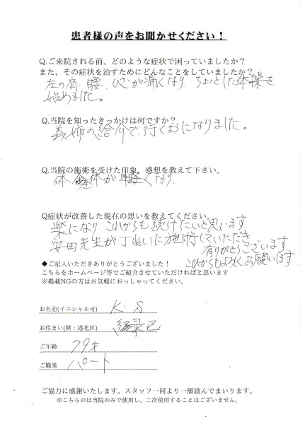 「身体全体が軽くなりました!」 左の肩、腰、膝が痛くなり困っていました。症状を治すために、ちょっとした体操を始めました。 義姉の紹介で知り、通うようになりました。 施術を受けて、身体全体が軽くなりました。 現在は、楽になりこれからも続けたいと思います。安田先生に丁寧に施術していただき感謝しています。ありがとうございます。これからもよろしくお願いします。 (K・Sさん 70代 女性) ※効果には個人差があります |